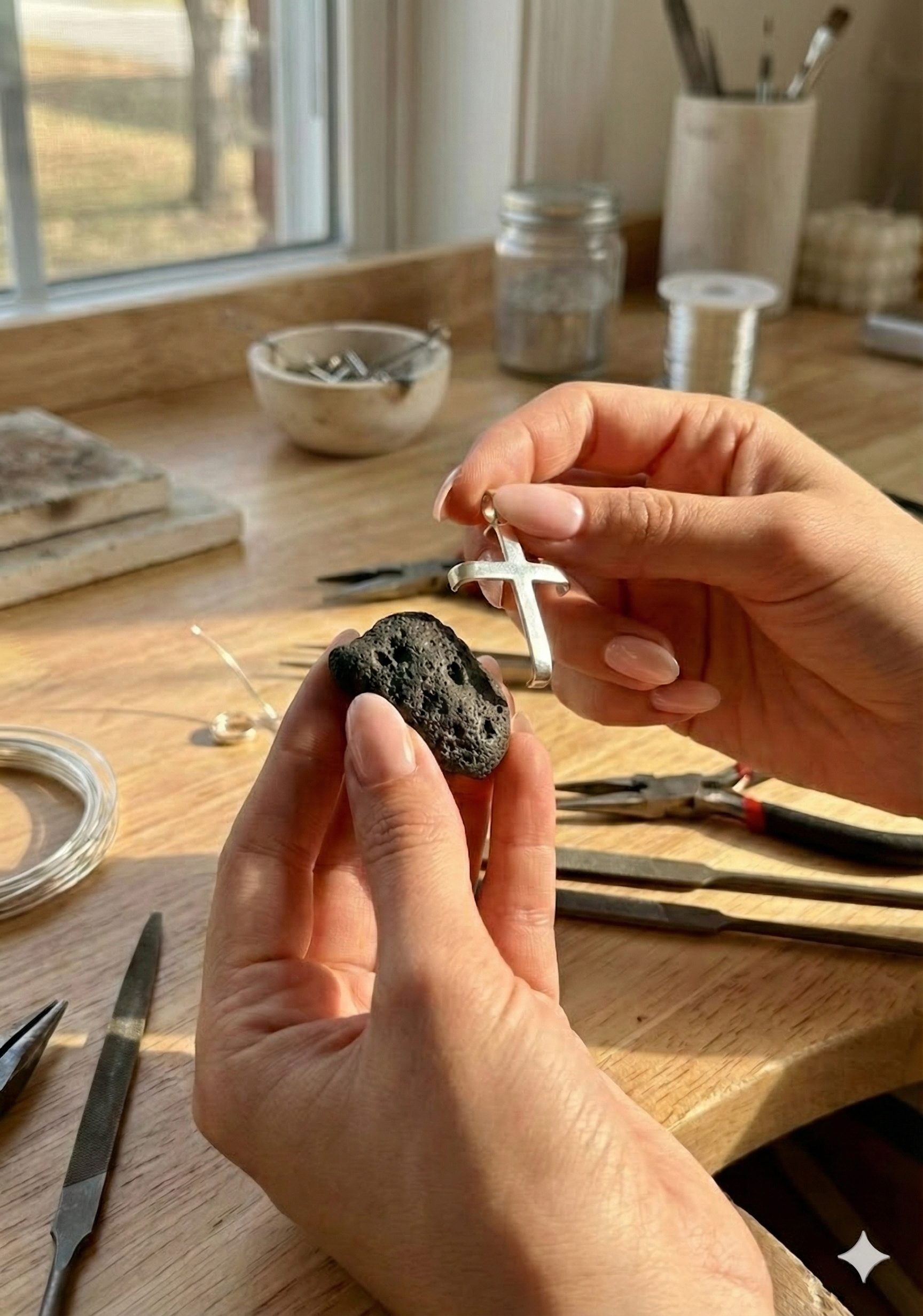 Handcrafted in a limited edition of 100 pieces from ancient basalt stones gathered along the shores near the Church of the Beatitudes, by the Sea of Galilee. Each piece is wrapped by hand in solid 925 silver. A rare union of place, material, and craft.
